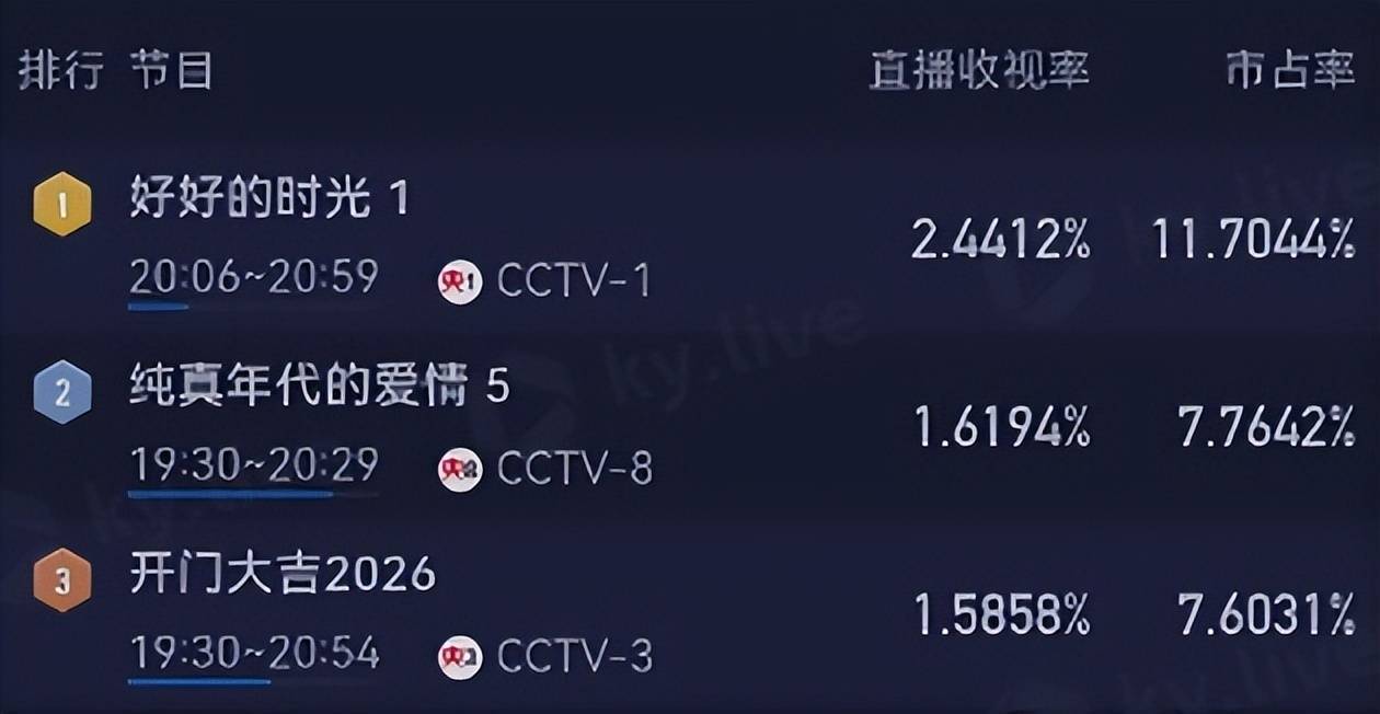 由梅婷、田雨领衔主演,李雪琴、陈昊宇等参演的《好好的时光》登陆央视一套黄金档和芒果TV。开播仅10分钟,这部剧收视率就冲上2.4%,直接飙升至全国收视率第一,把隔壁播了3天的《纯真年代的爱情》远远甩在身后,实现了断层式碾压 。